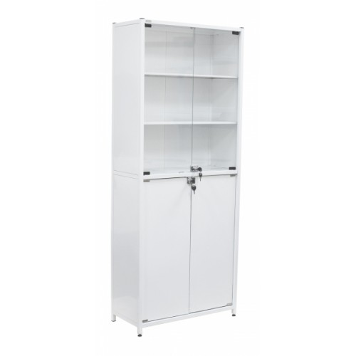 Шкаф имеет два отделения, каждое из которых имеет по две двери с замком: верх – стекло, низ –металл, полимерно-порошковая краска. В верхнем отделении две металлические полки, в нижнем - одна.