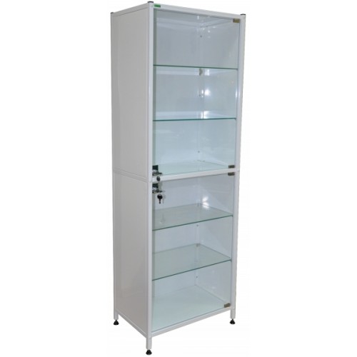 Шкаф имеет два отделения, каждая из которых имеет стеклянную дверь с замком. Полки стеклянные. Шкаф установлен на 4 регулируемые опоры.