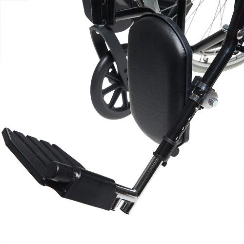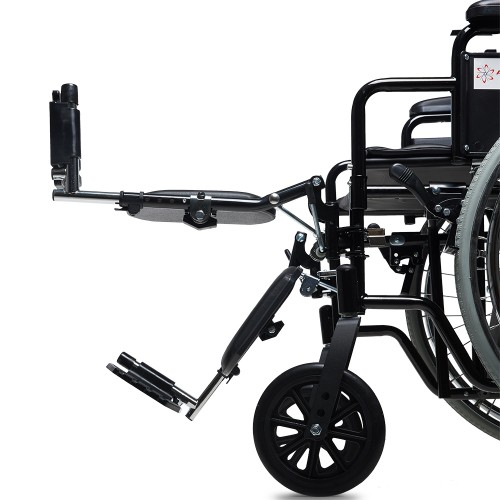 Кресло-коляска оснащена съемными, откидными, регулируемыми по высоте и углу наклона подножками с мягкими упорами для ног.